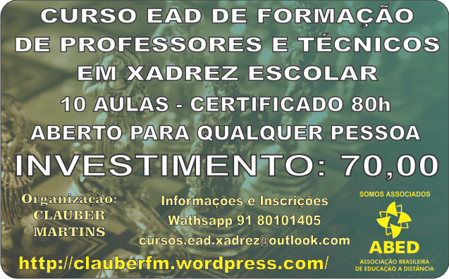 CURSO EAD DE FORMAÇÃO DE PROFESSORES E TÉCNICOS EM XADREZ ESCOLAR DEPÓSITO EM CONTA OU BOLETO BANCÁRIO AMBIENTE 100% SEGURO 10 AULAS – 7 XADREZ TÉCNICA + 3 XADREZ DOCÊNCIA E PROJETOS -1.455755 -48.490180 Nazaré, Belém - PA, Brasil Compartilhe Aqui: Email a link to a friend(abre em nova janela) E-mail Compartilhe no Linkedin(abre em nova janela) LinkedIn Imprimir(abre em nova janela) Imprimir Compartilhar no Facebook(abre em nova janela) Facebook Compartilhar no X(abre em nova janela) 18+ Compartilhar no WhatsApp(abre em nova janela) WhatsApp Compartilhar no Telegram(abre em nova janela) Telegram Curtir Carregando... Relacionado Publicado por Admin Ver todos os posts de Admin
